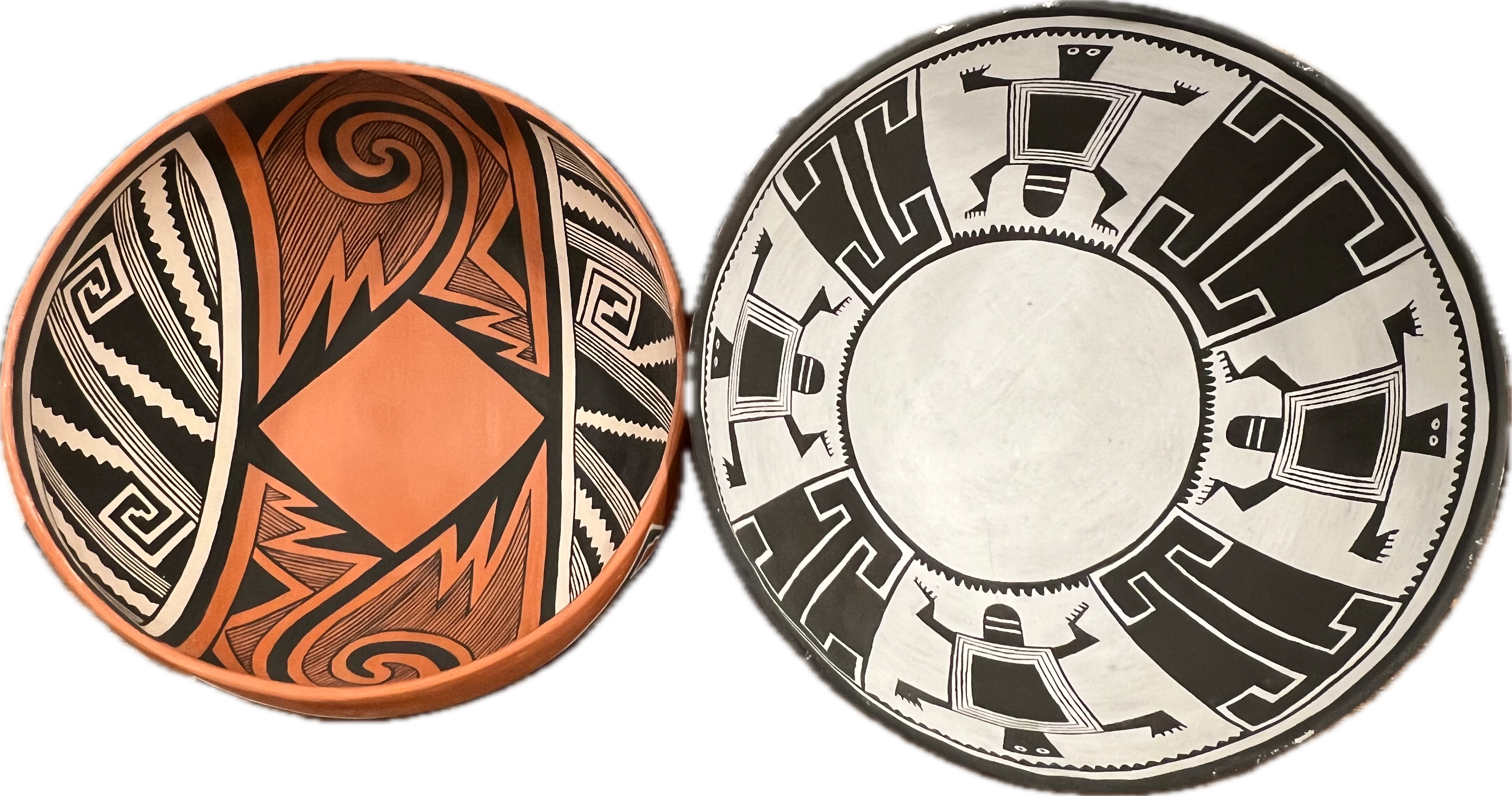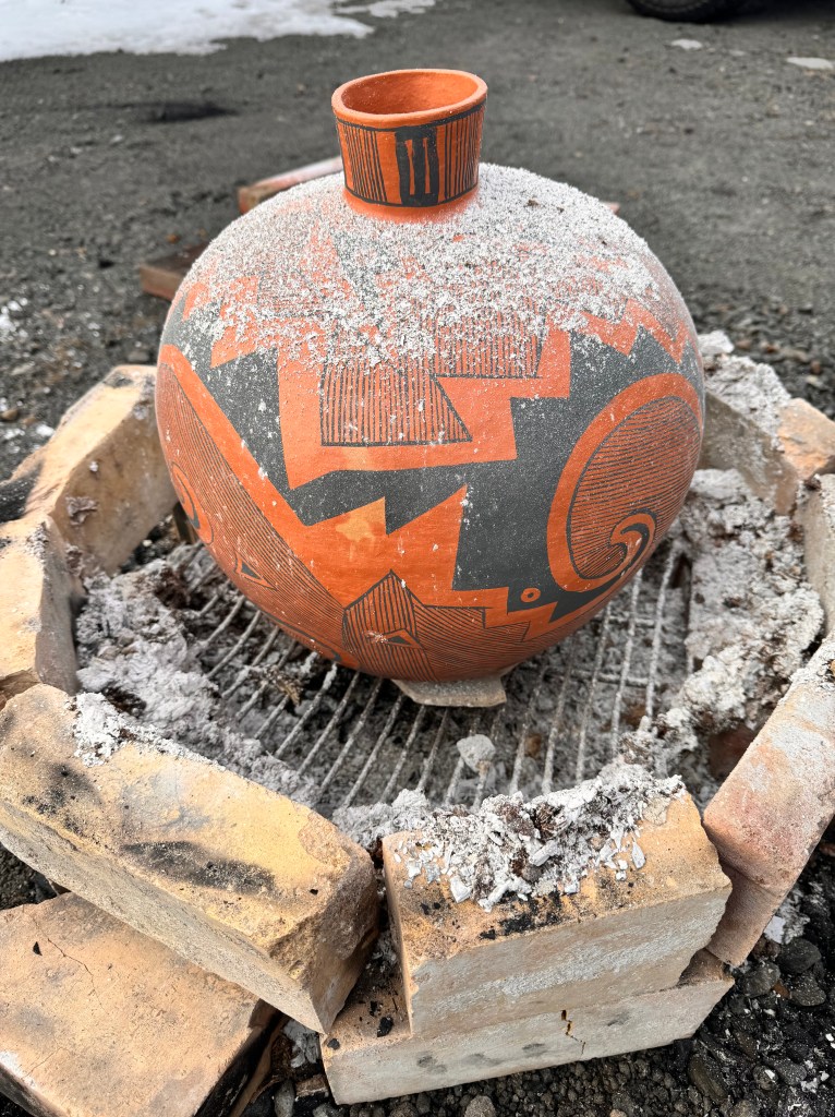 We strive to make our pots with as many ancient techniques as possible. We collect wild clay, temper for building our pots. We also collect minerals and organic material to make our paints and slips. Additionally we collect yucca brushes for painting. Rib bones from dead deer for scraping our pots, and stones from river bottoms for polishing. Then to top things off, we fire with wood in the back yard on the ground or in a trench kiln.