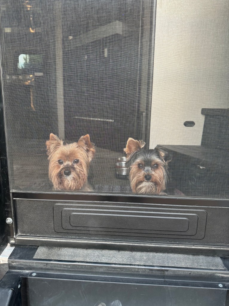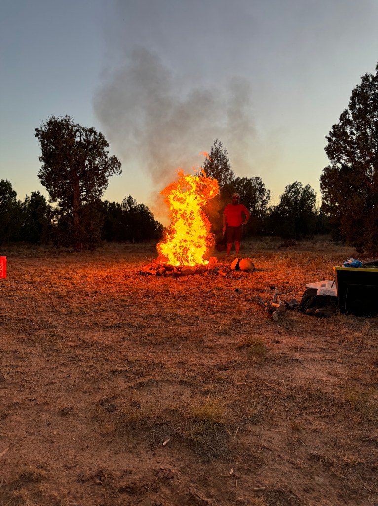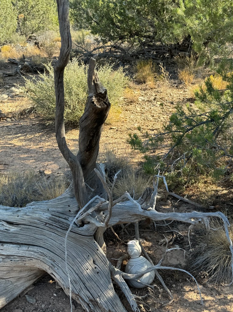 From left to right top to bottom: Mapache pot before firing, Lolli pot before firing, Willy and Waylon at camper door, firing, firing, reducing, olivine, hiding Lolli pot, Lolli hiding pot, pot final place, hiding Mapache pot, pot final resting place, zoomed in final resting place of Mapache pot. MAPACHE’S BIRD POT HAS BEEN FOUND!!!