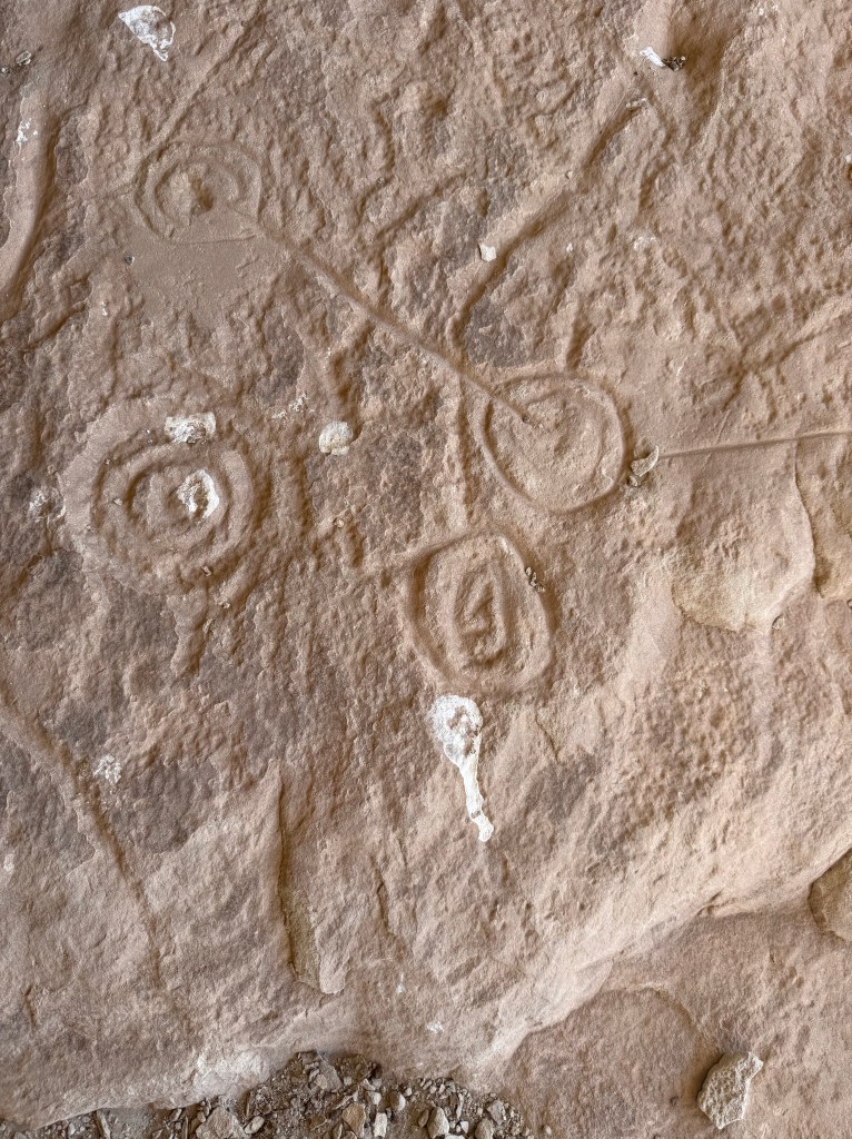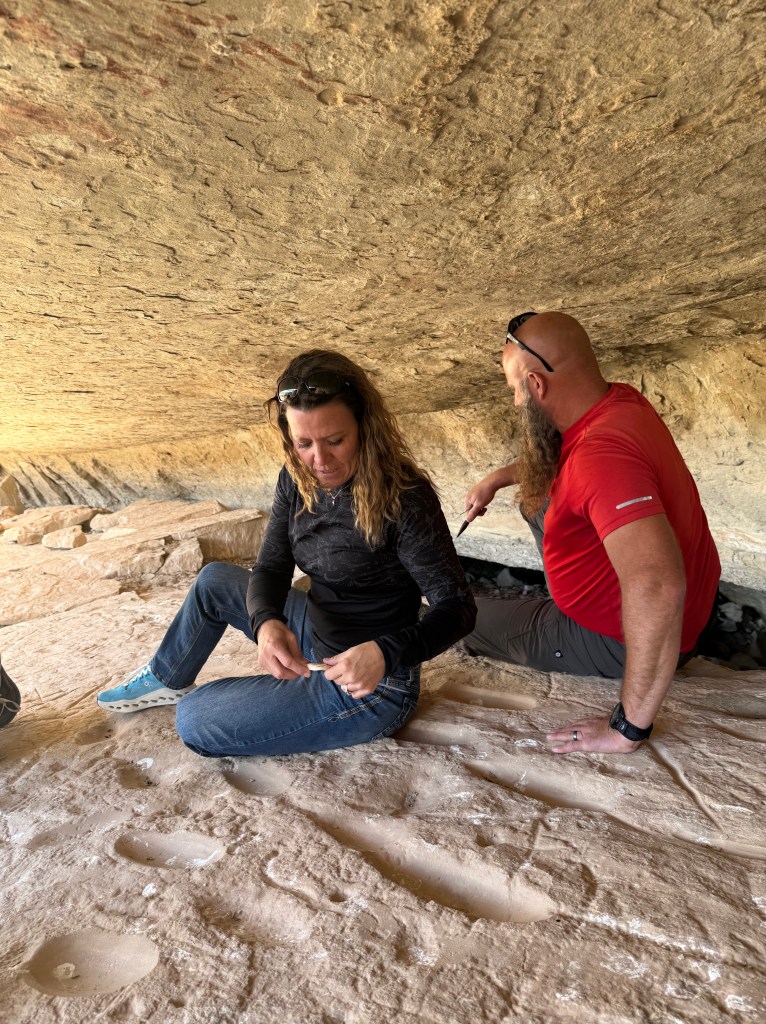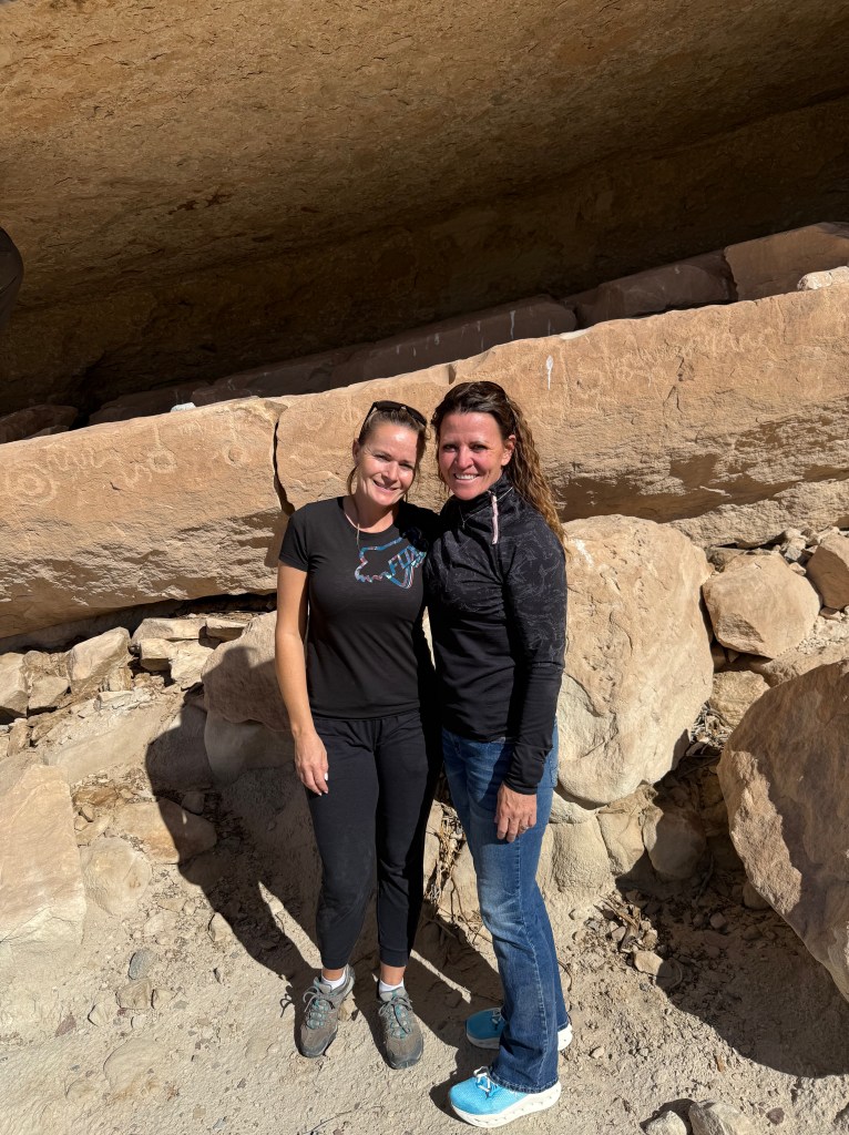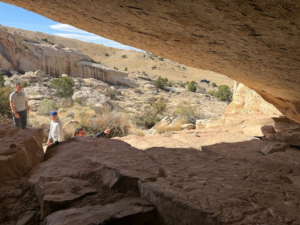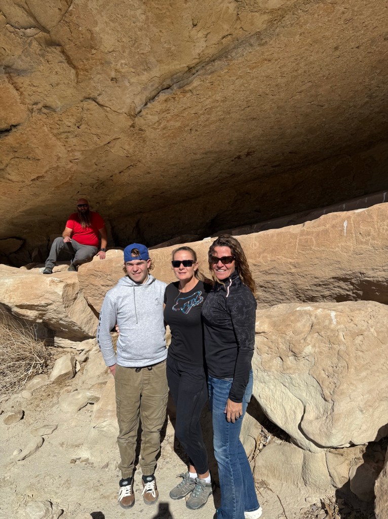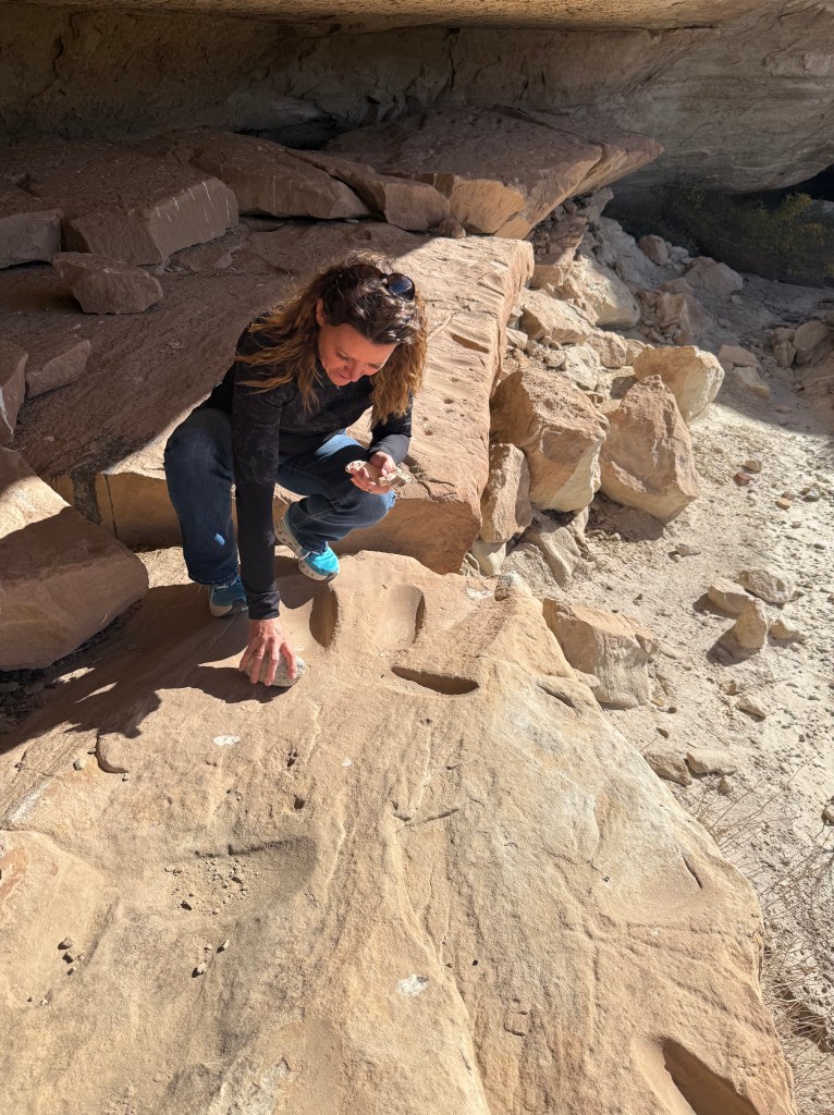 We wanted to show them what we enjoy doing here so we took them to a sandstone alcove covered in ancient art—petroglyphs, pictographs, and rock slabs ground smooth from centuries of use, like metates frozen in time. Standing there, it’s hard not to feel connected to the hands and hearts that came before us, shaping stories into stone under the same desert sun.