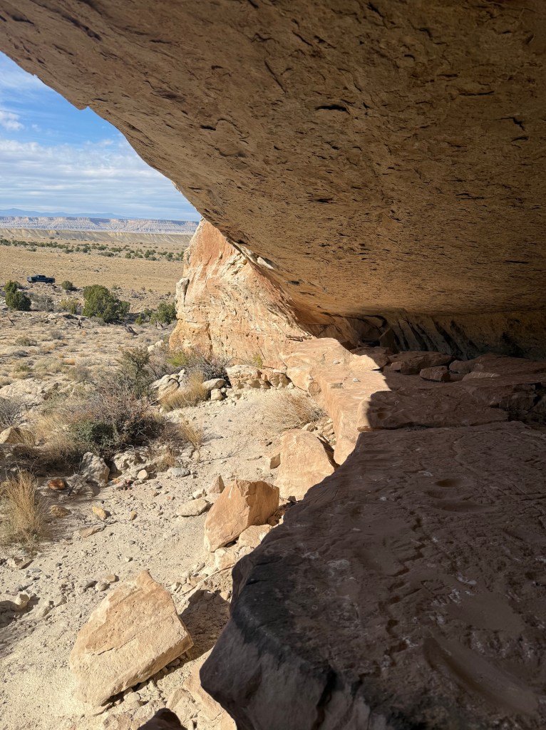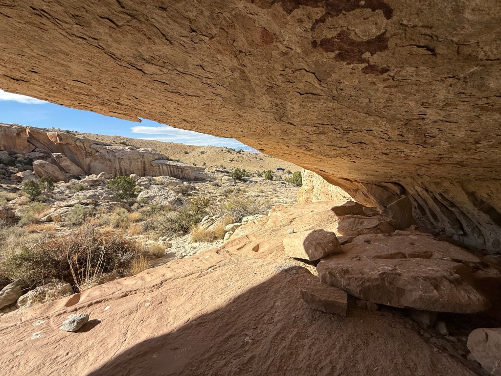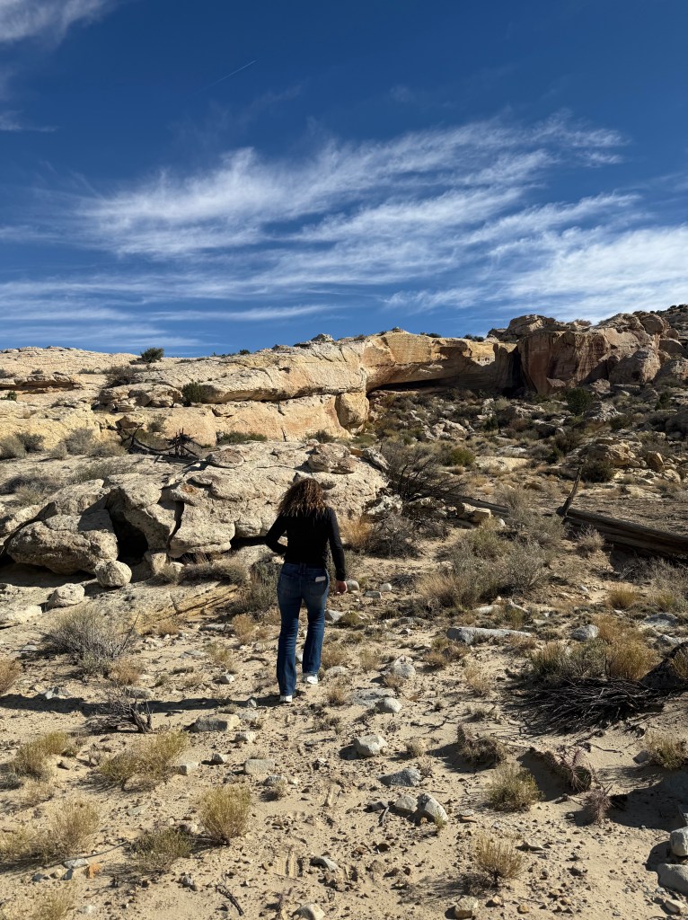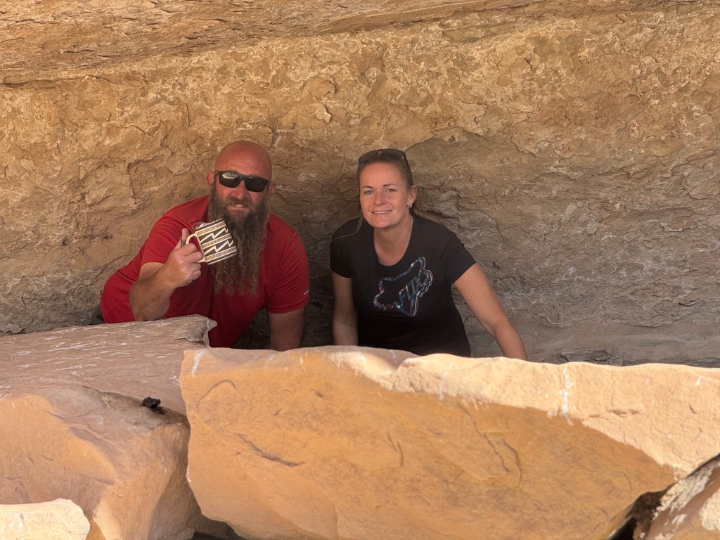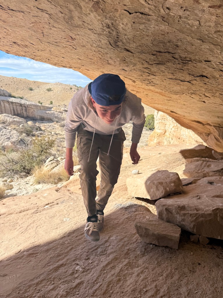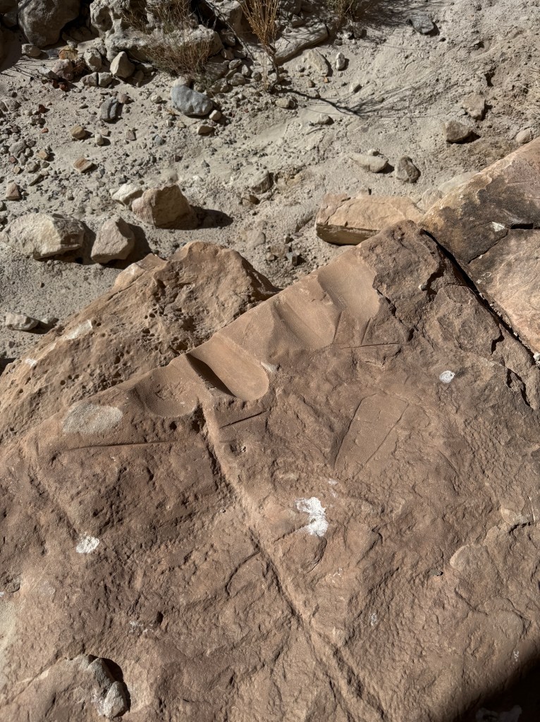 We wanted to show them what we enjoy doing here so we took them to a sandstone alcove covered in ancient art—petroglyphs, pictographs, and rock slabs ground smooth from centuries of use, like metates frozen in time. Standing there, it’s hard not to feel connected to the hands and hearts that came before us, shaping stories into stone under the same desert sun.